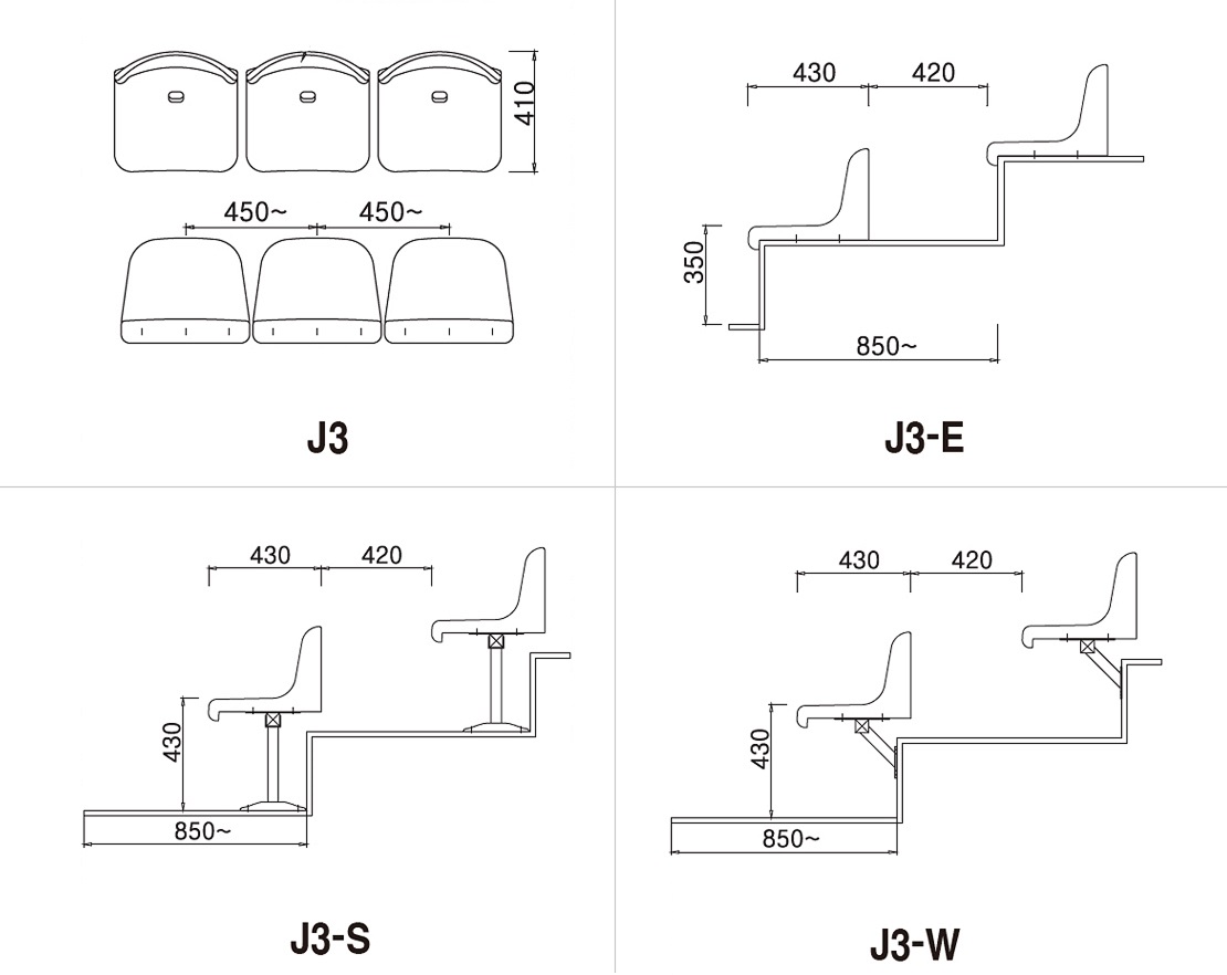 ■ Centro a centro por asiento: 450 mm -