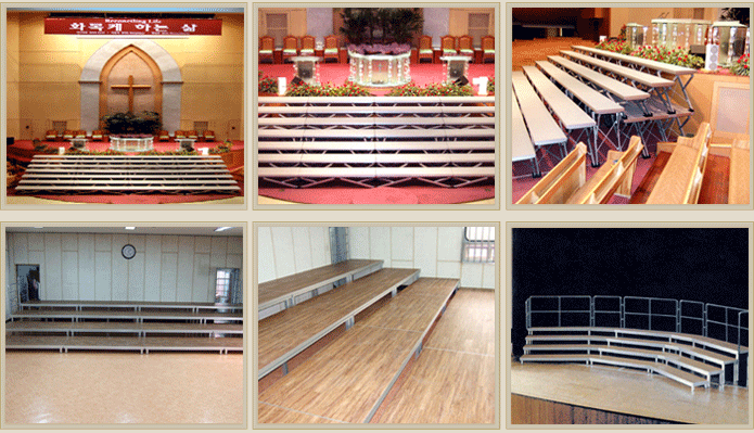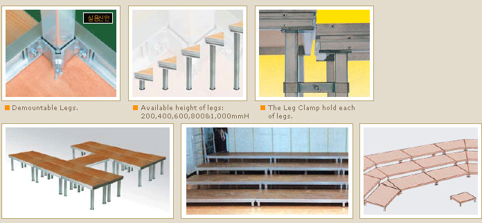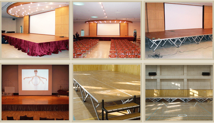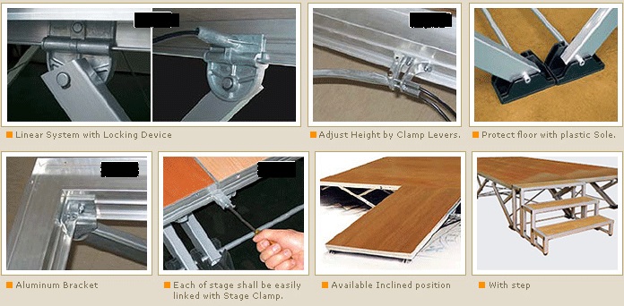 Escenario de Tamaño Estándar es 1 m x 2 m. Cada modulo se puede vincular fácilmente con varias abrazaderas. La altura de la Plataforma es variable y ajustable.